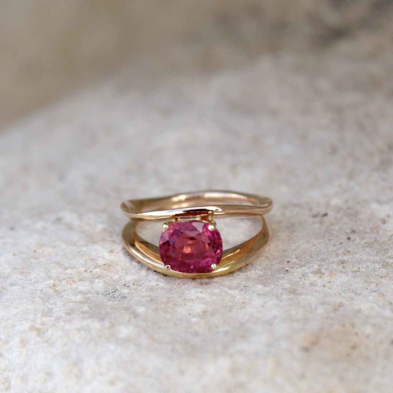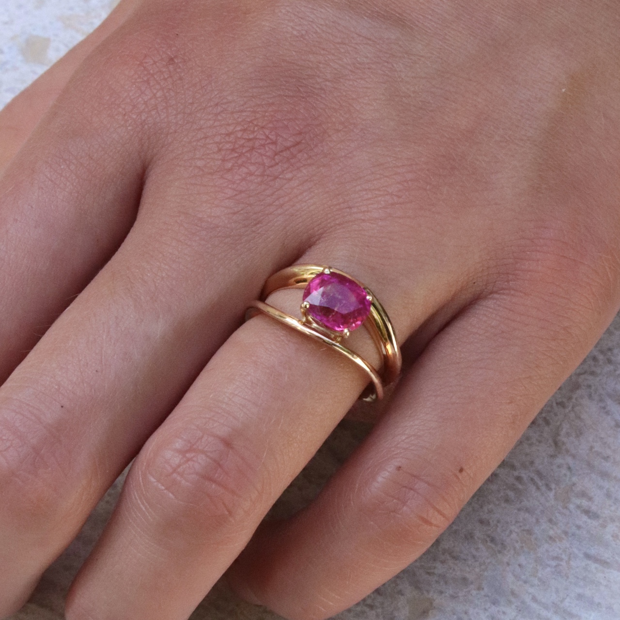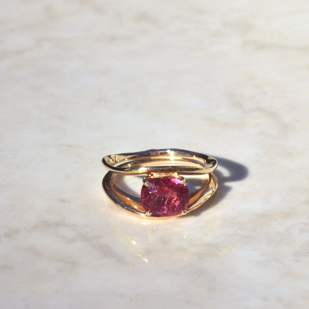 Une pierre d’un rose subtil et joyeux sertie dans un châton retenu par deux souffles d’or.